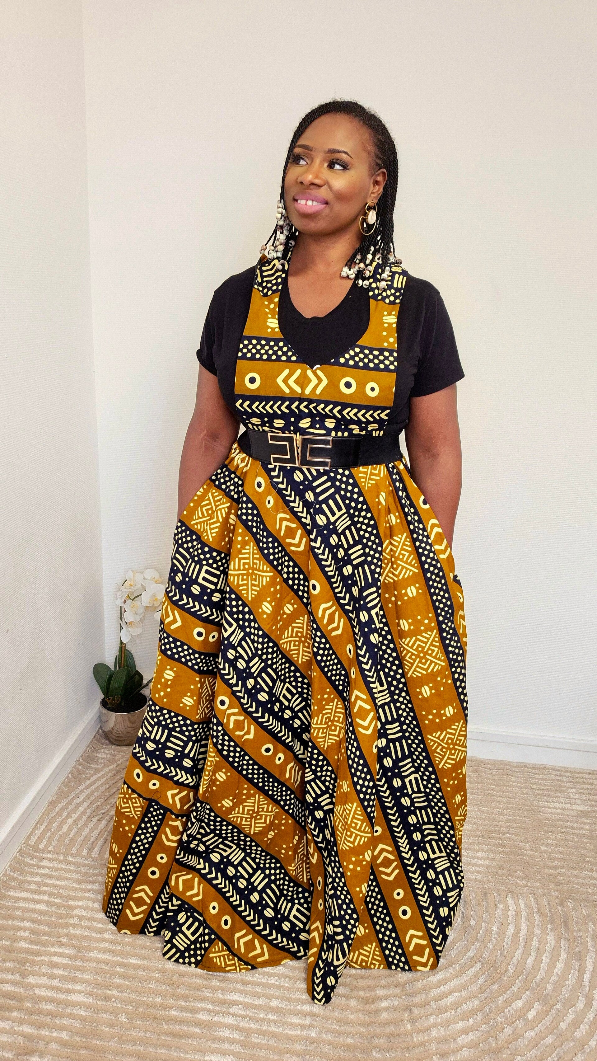 Cette longue robe salopette Coupe évasée à  taille élastique, confortable, élégante, est un basique original du dressing facile à porter et à accessoiriser dans tous les styles.