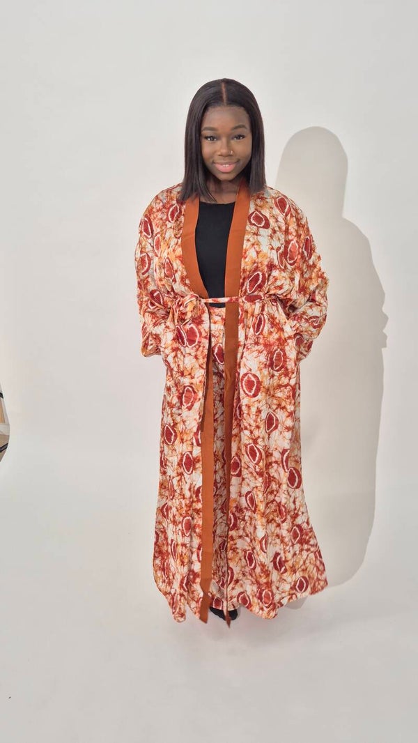Cet ensemble kimono trois pièces pour femme, confectionné en soie de qualité supérieure, est une pièce intemporelle alliant élégance et raffinement. Il se compose d'un long kimono à manches longues et col ouvert, d'un pantalon taille haute avec poches et bas larges, et d'une ceinture assortie. L'ensemble est conçu pour une silhouette flatteuse et un style classique.